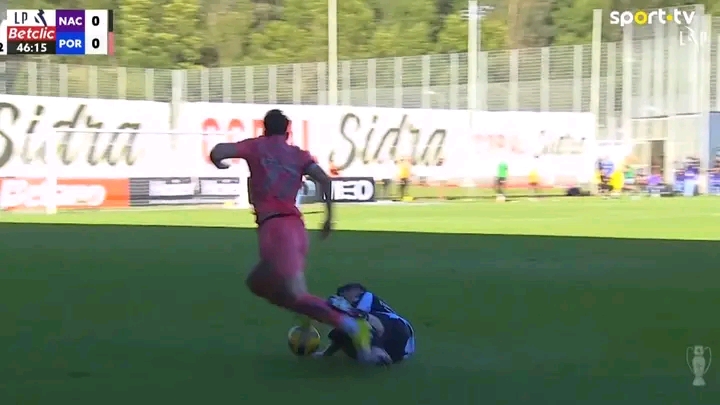 Aos 45+1′, Oskar Pietuszewski seguia no lado esquerdo do terreno, mas foi travado em falta por Chico Gonçalves, que derrubou o polaco.